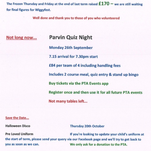 PTA Parvin Quiz Night- Monday 26th September BOOKING CLOSING DATE 19th SEPTEMBER