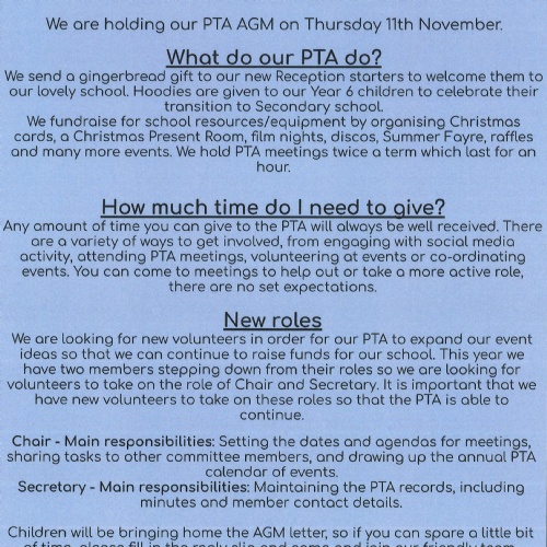 PTA AGM Tuesday 12 November 2024