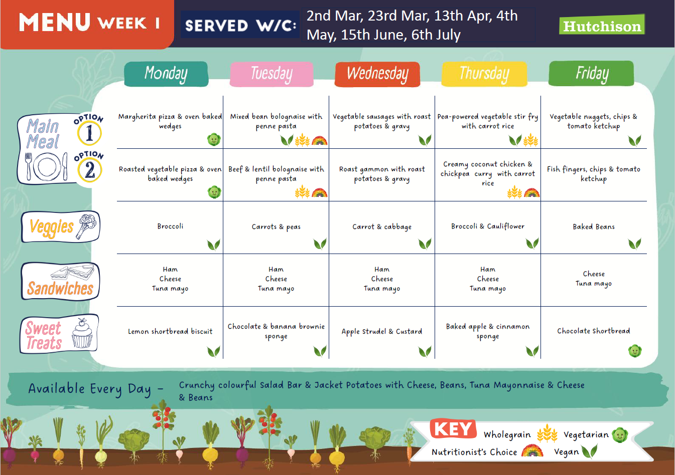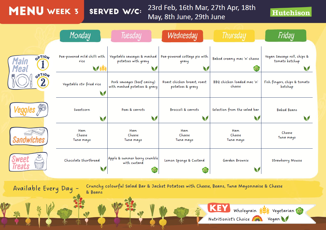There are 3 hot dinner options for your child to choose from each day, as well as a number of sandwich choices.